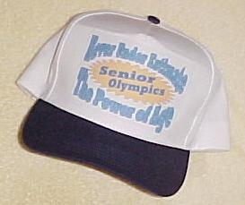 click photo to view enlargement Senior Olympics Hat 100% Cotton Twill White Cap with Navy or Red visor. Plastic snap size adjuster $10.00